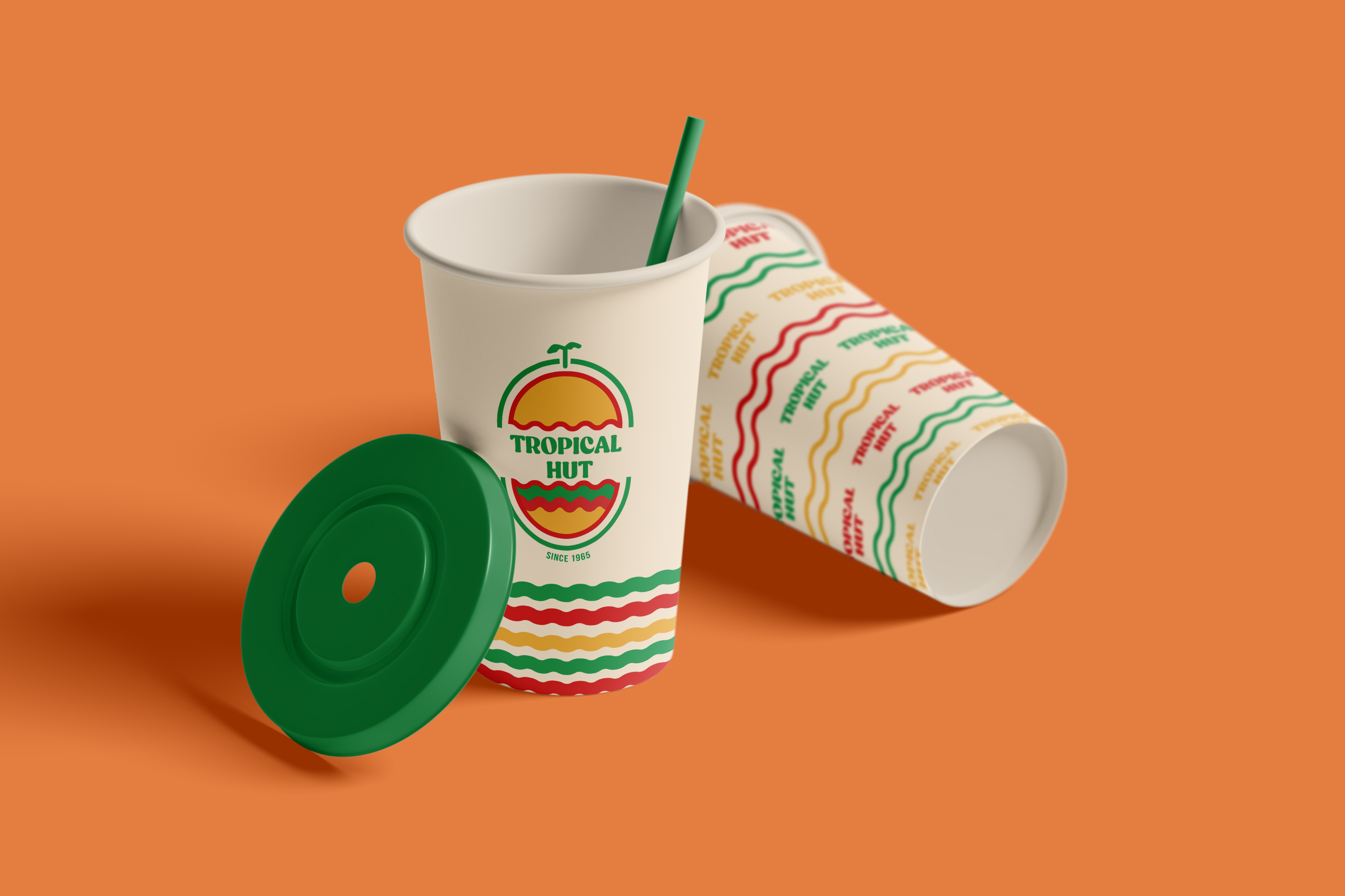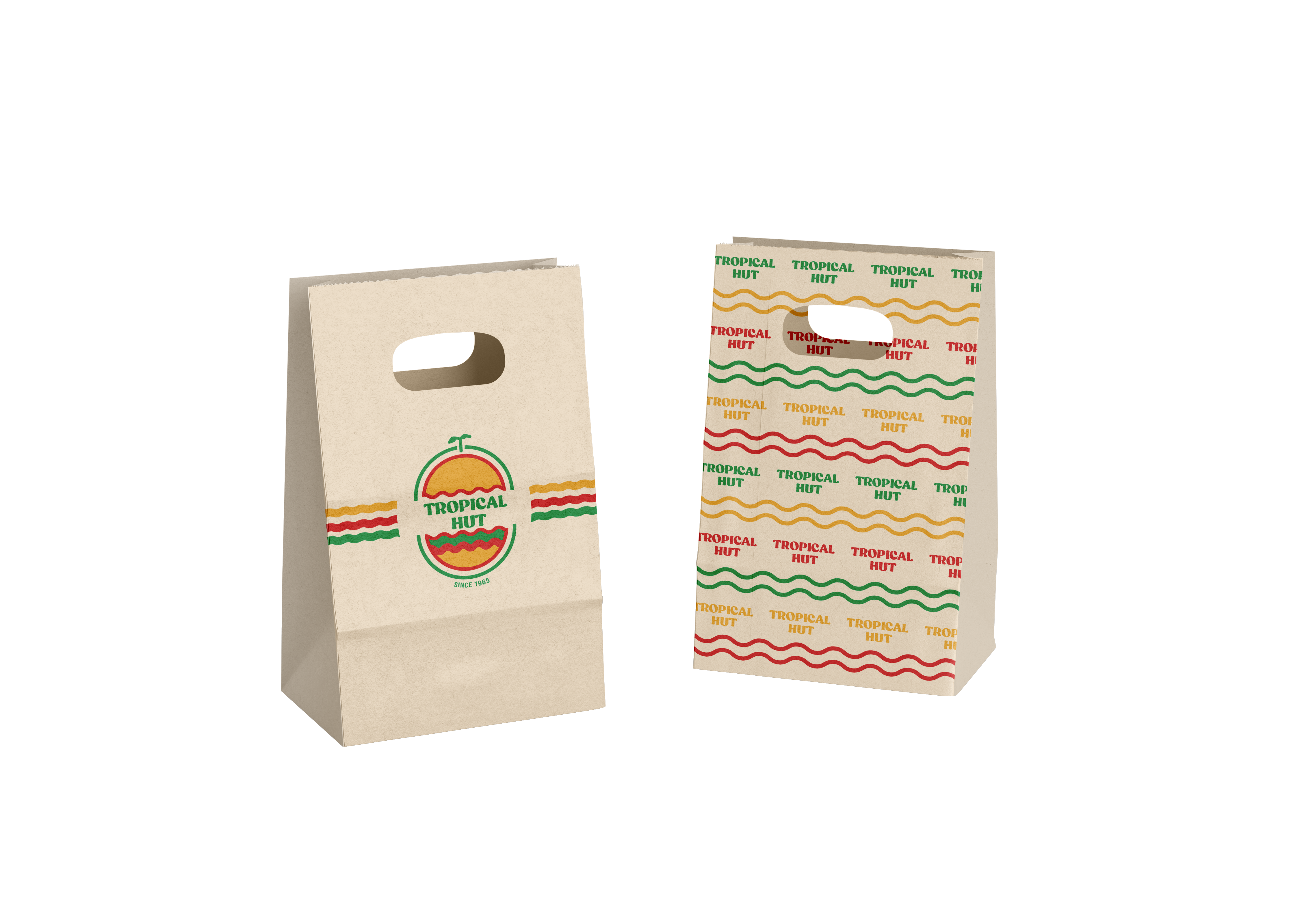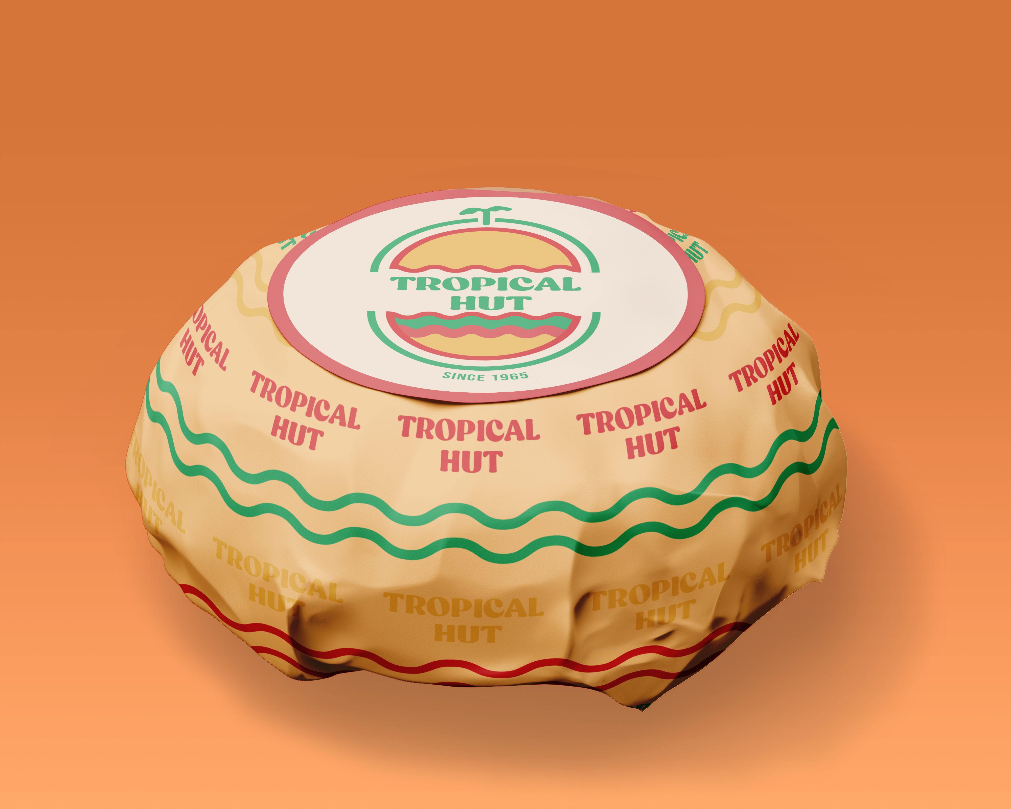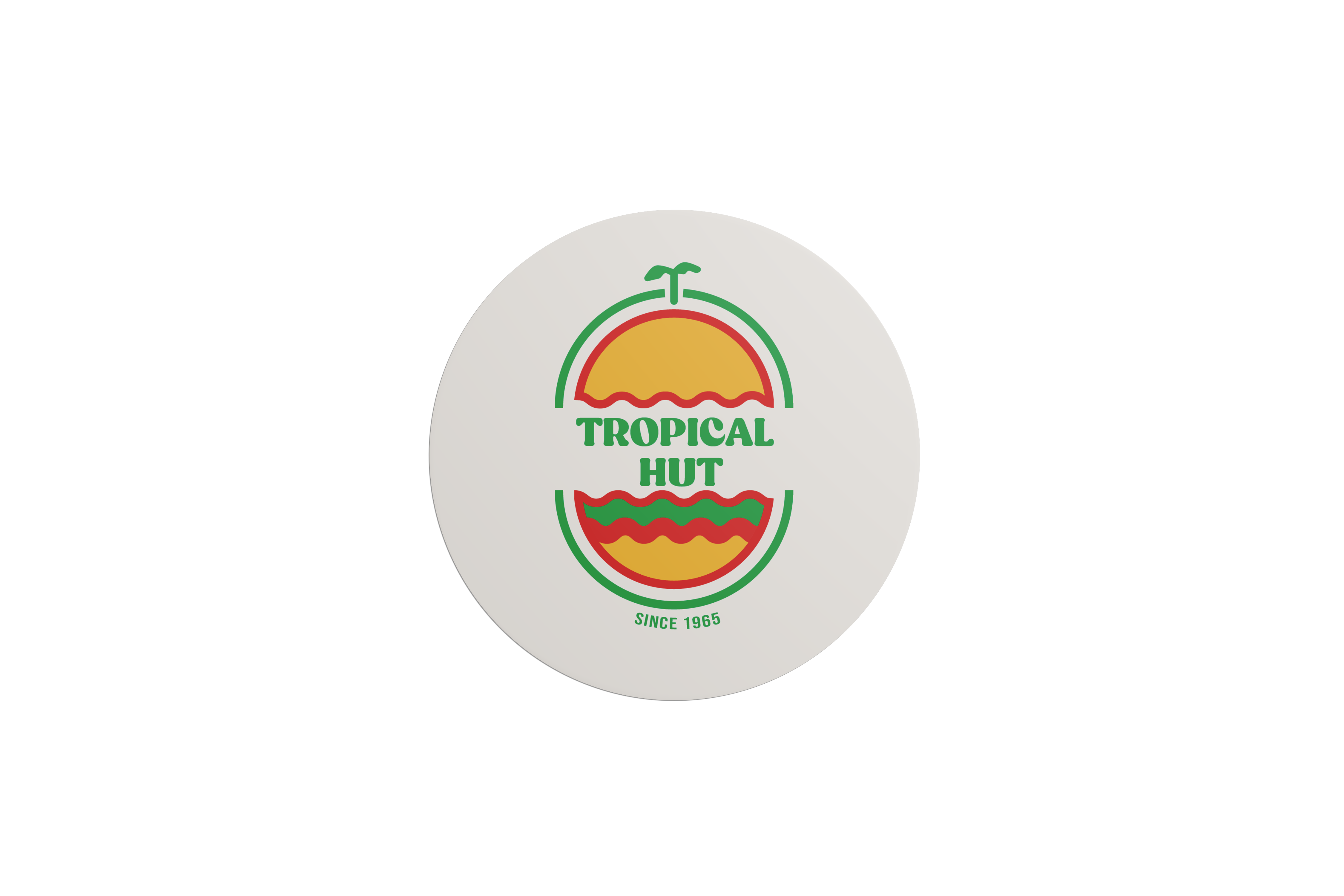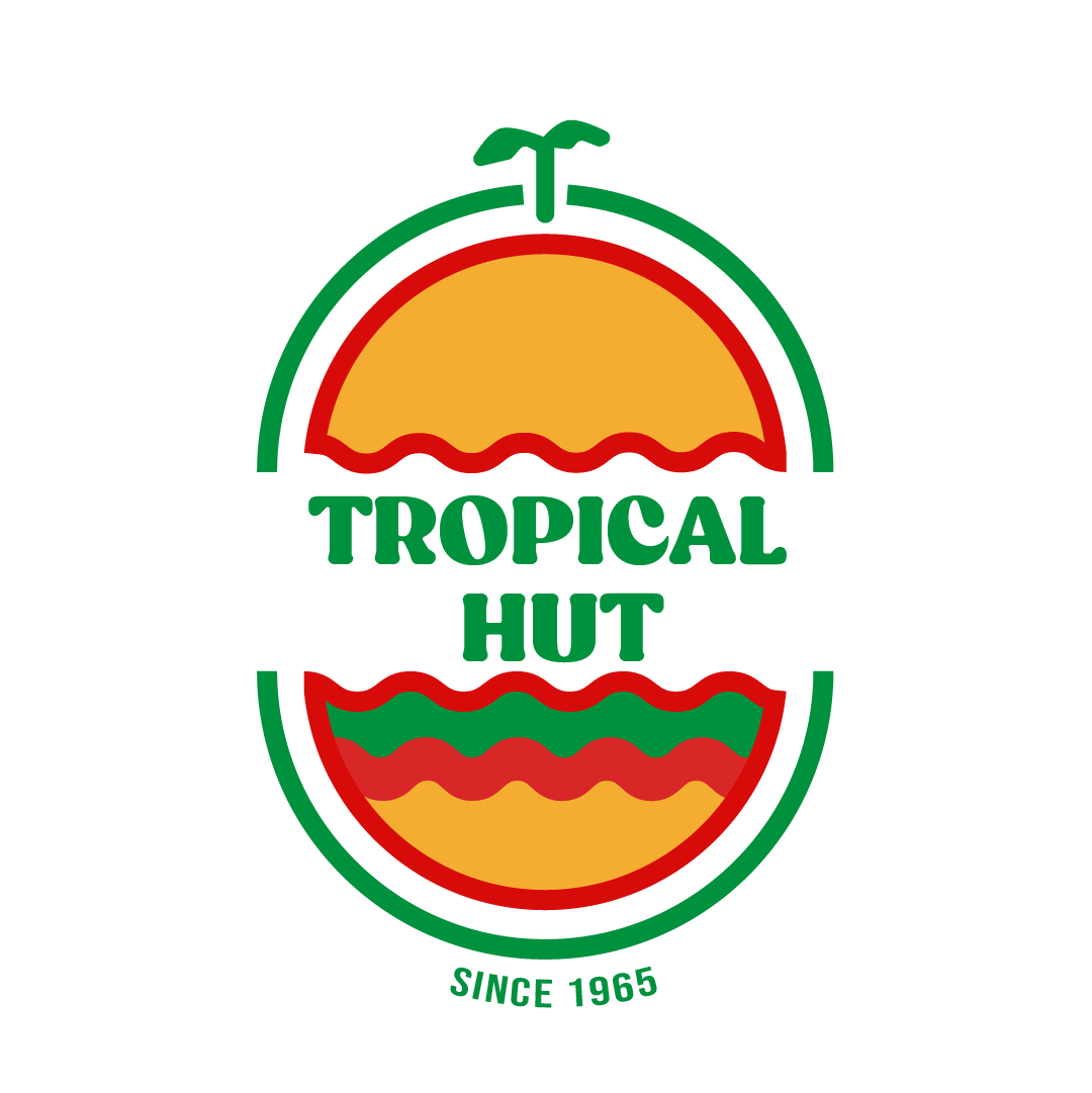The logo draws inspiration from retro signages and features an elongated, non-circular shape. Its design elements include wavy lines, a palm tree and island, and a hut or bun, reflecting the brand’s tropical and nostalgic identity. The color palette and overall style aim to capture the warmth, fun, and retro charm of Tropical Hut while keeping it familiar to its audience. The logo was created through a collaborative design process among the members of the group.