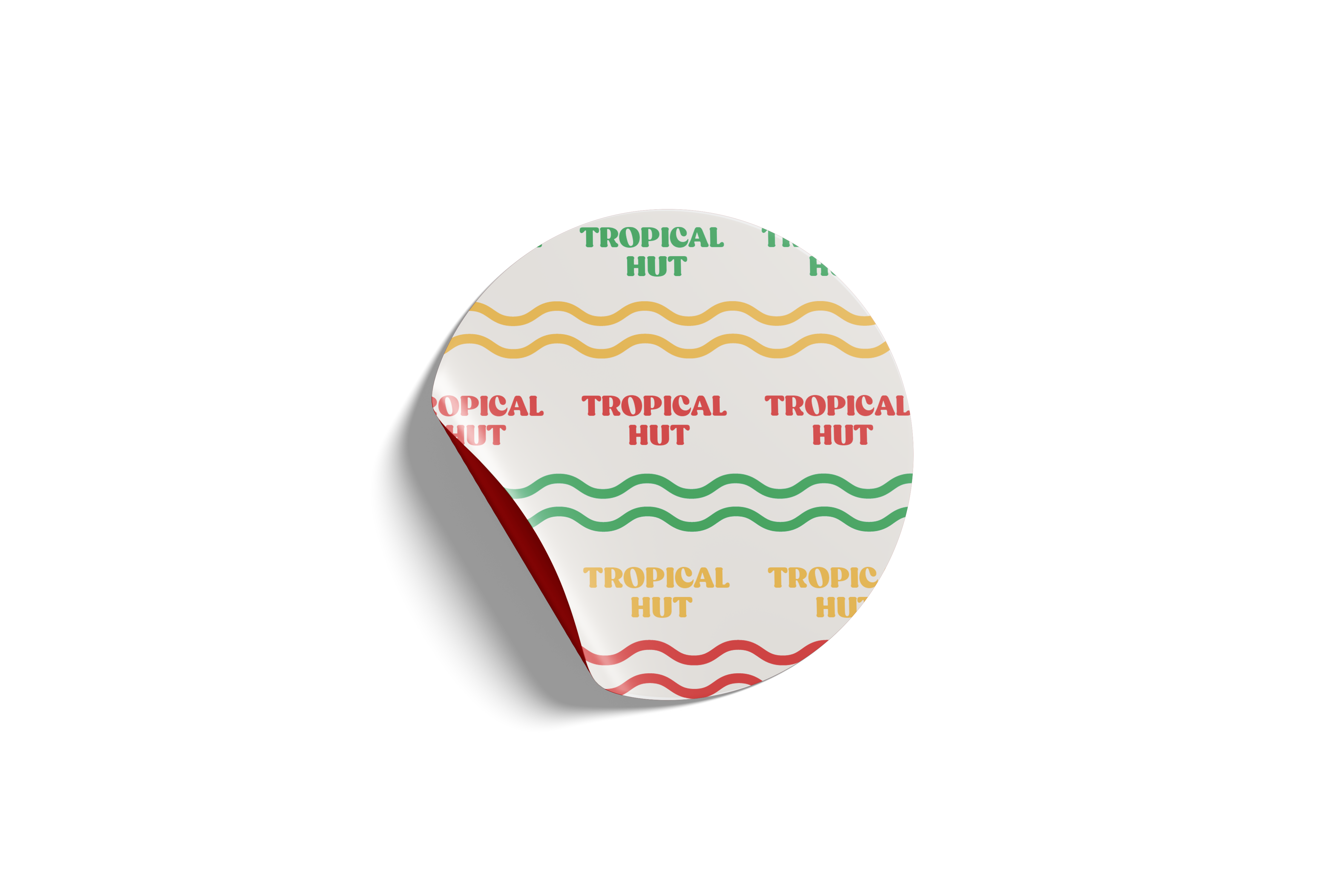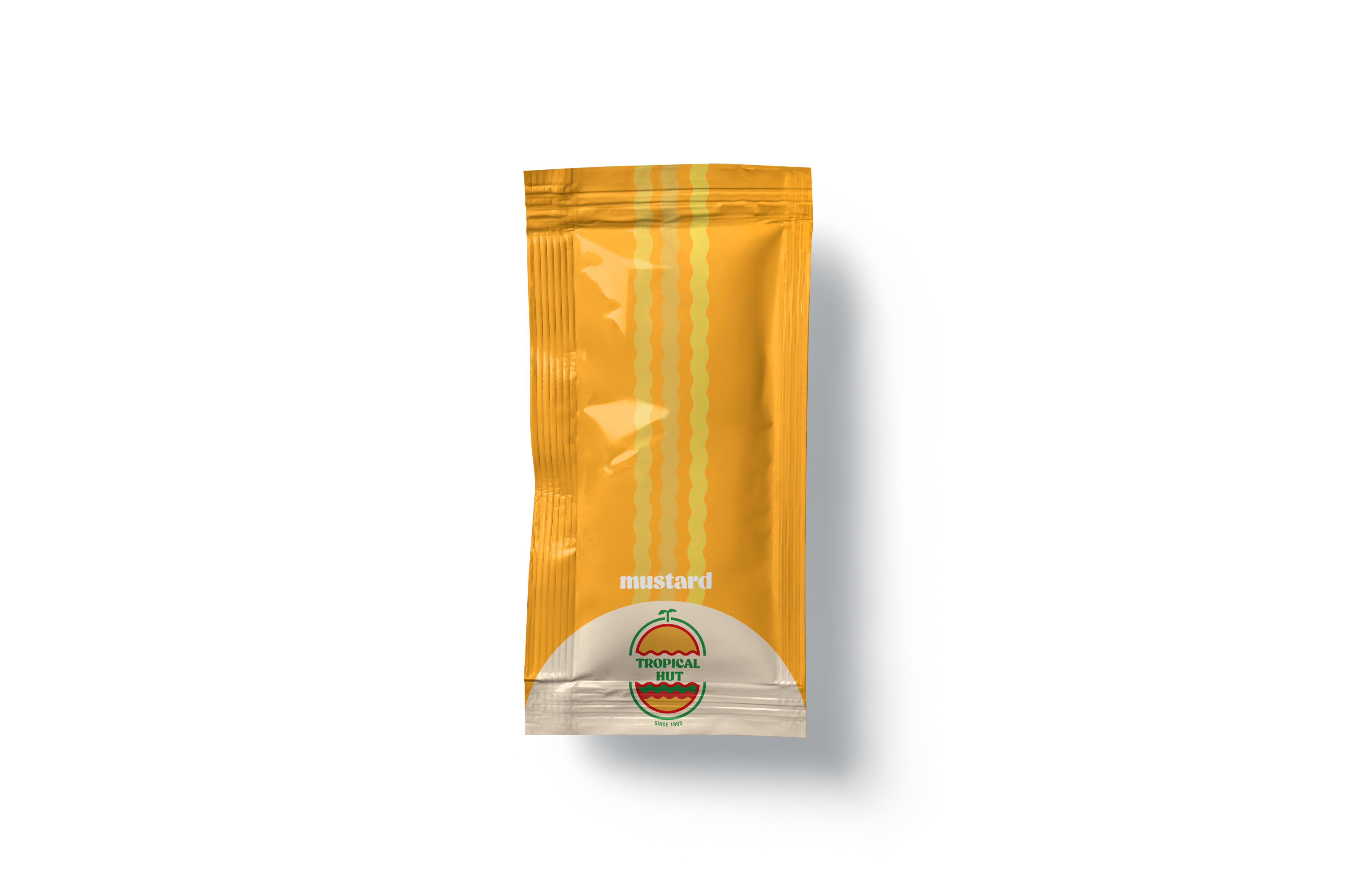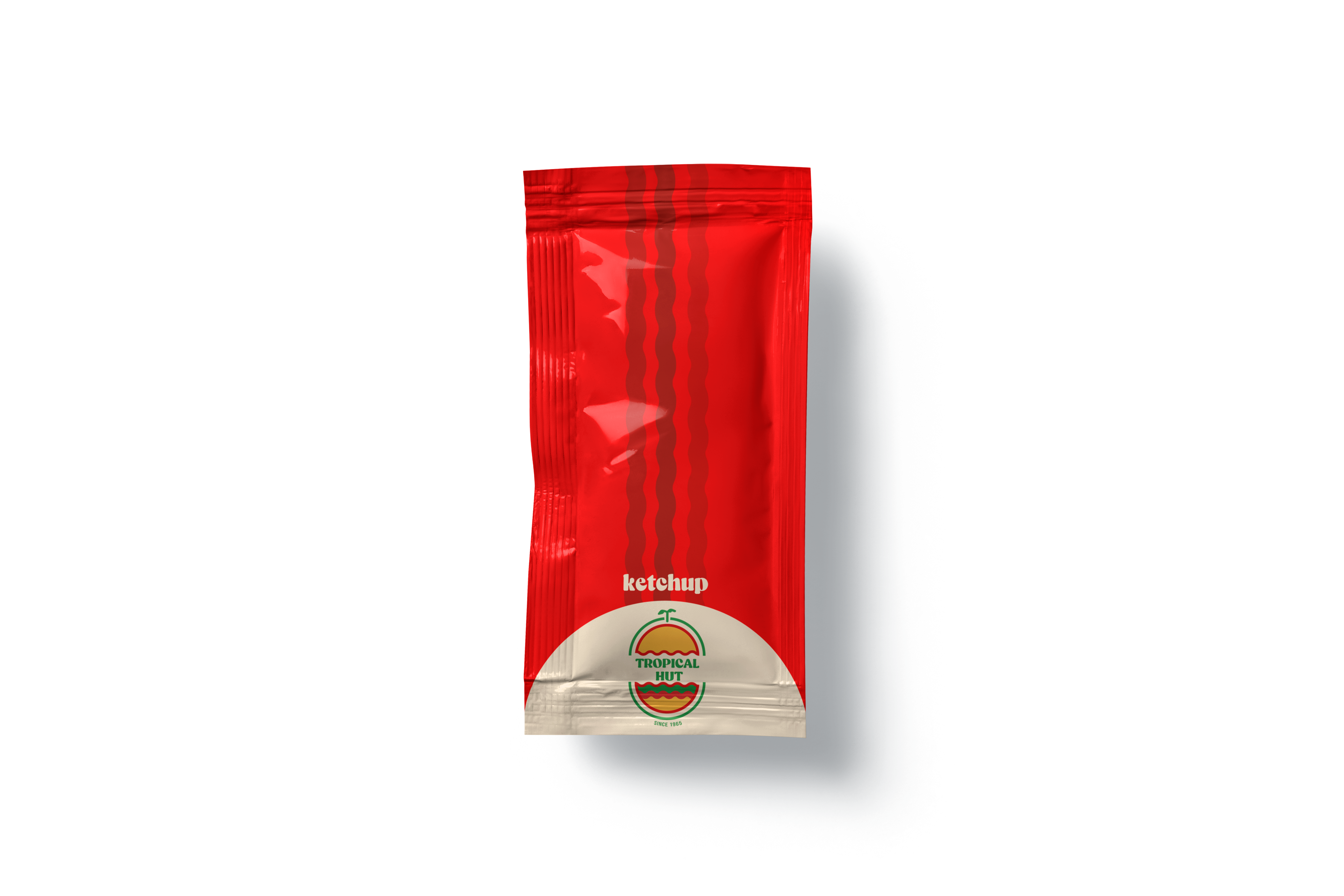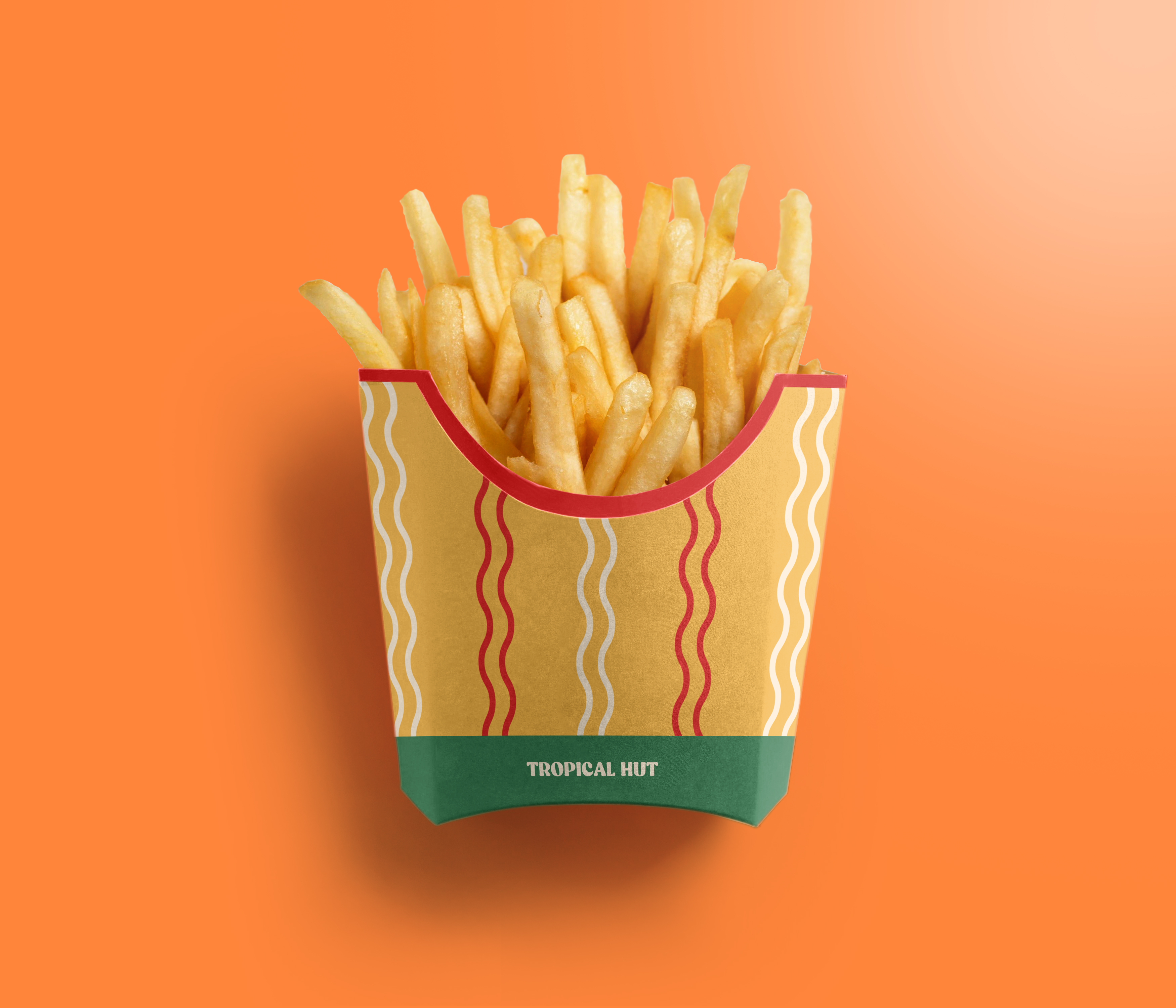 The logo draws inspiration from retro signages and features an elongated, non-circular shape. Its design elements include wavy lines, a palm tree and island, and a hut or bun, reflecting the brand’s tropical and nostalgic identity. The color palette and overall style aim to capture the warmth, fun, and retro charm of Tropical Hut while keeping it familiar to its audience. The logo was created through a collaborative design process among the members of the group.